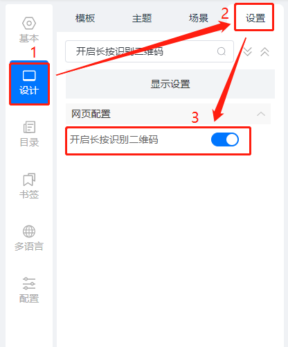 點擊【設計】,然后點擊【設置】,打開【開啟長按識別二維碼】。
