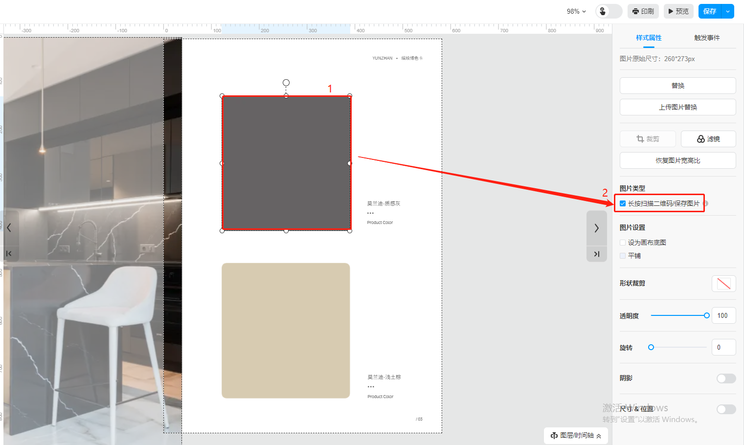 選中插在頁面上產品圖,打開【長按掃描二維碼/保存圖片】。