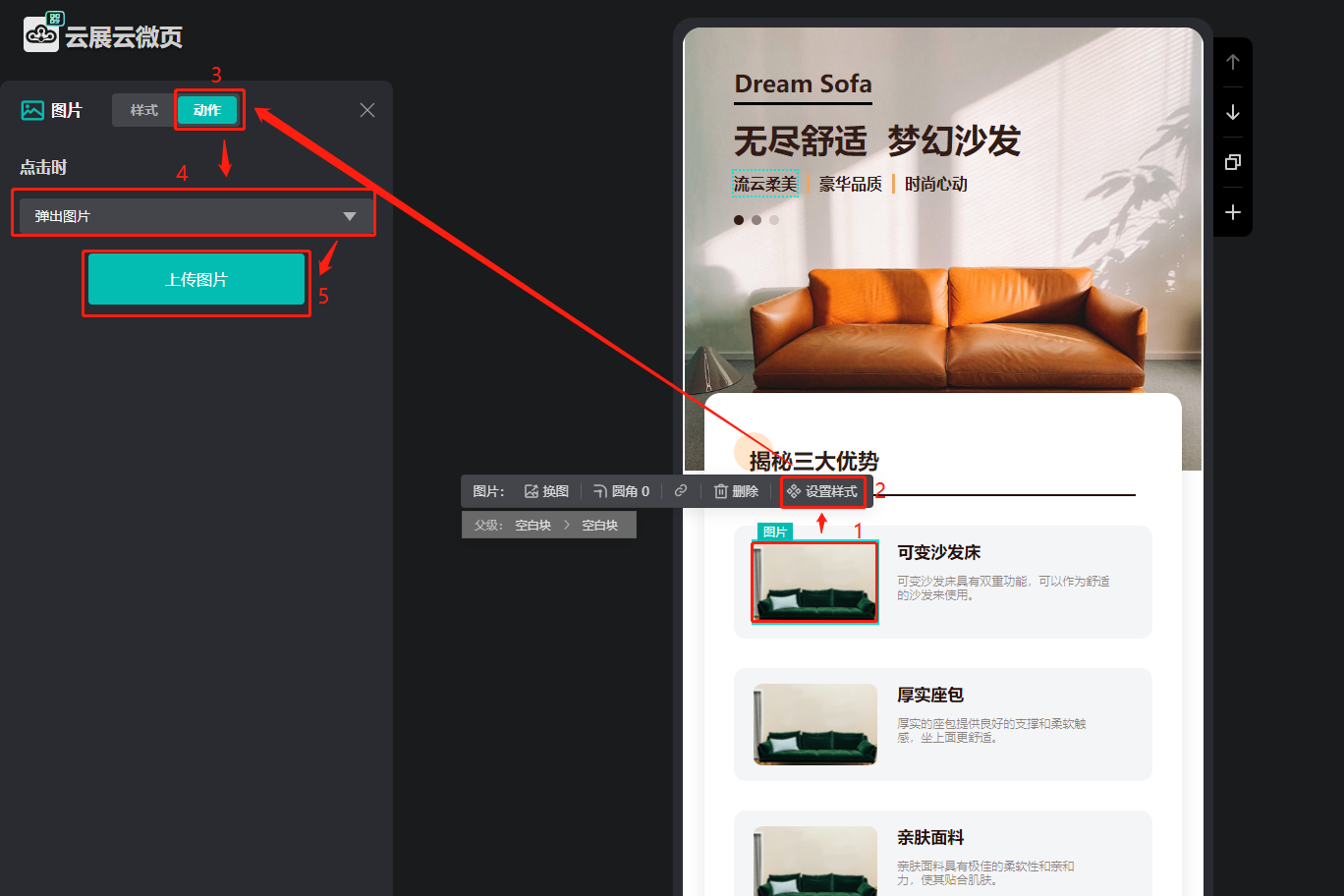微碼中的圖片如何點擊彈出大圖? 一、功能介紹 這個功能的作用就是可以實現點擊微碼中的圖片彈出大圖,效果如下: 二、操作步驟 1、打開編輯界面 點擊【我的微碼】,選擇需要編輯的微碼,點擊【編輯】。 2、設置動作 選中圖片,點擊【設置樣式】,然后點擊動作,【點擊時】選擇【彈出圖片】,意思是點擊圖片就會彈出上傳的圖片,最后點擊【上傳圖片】。 3、保存 點擊右上角保存。