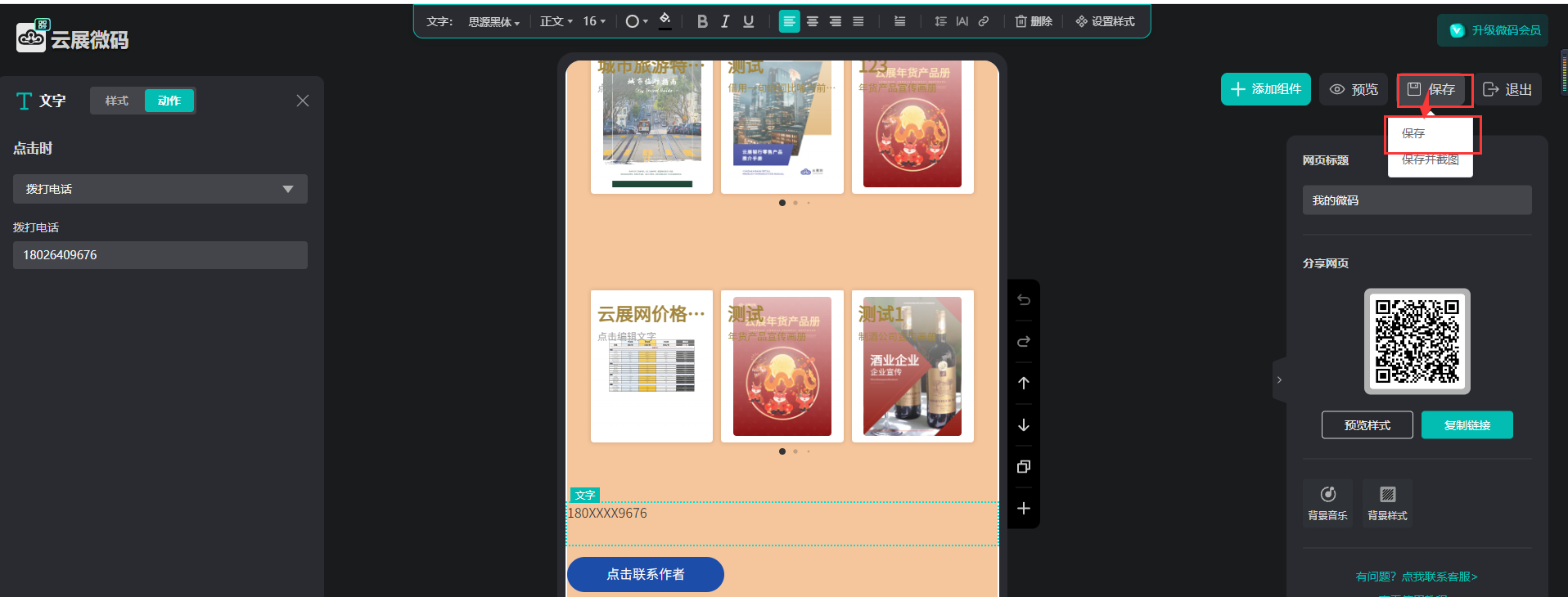 點擊【添加組件】,點擊【文字】或者【按鈕】,輸入聯系電話號碼/聯系作者