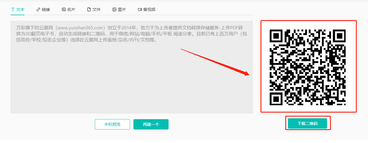 多功能二維碼生成器可以將文本、鏈接、名片、文件、圖片、音視頻,轉(zhuǎn)換為一個二維碼,手機上隨時隨地掃碼觀看。