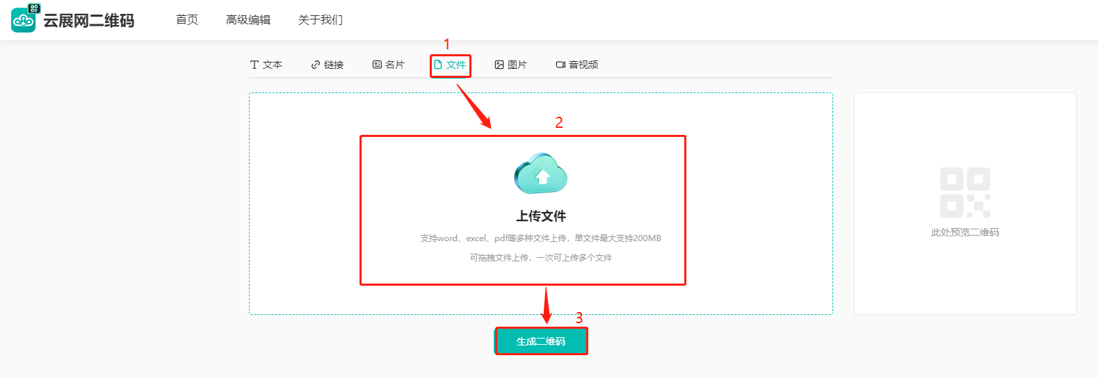 (1)點擊【文件】,然后點擊下方【上傳文件】上傳文件,點擊【生成二維碼】。