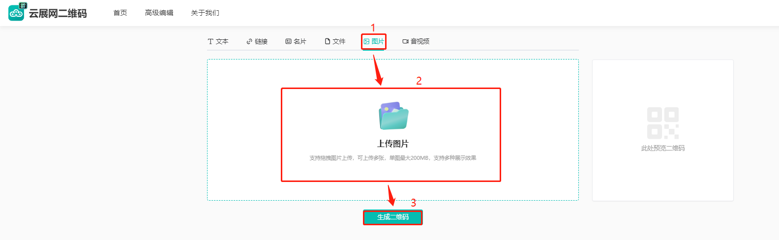 (1)點擊【圖片】,然后點擊下方【上傳圖片】上傳圖片,點擊【生成二維碼】。